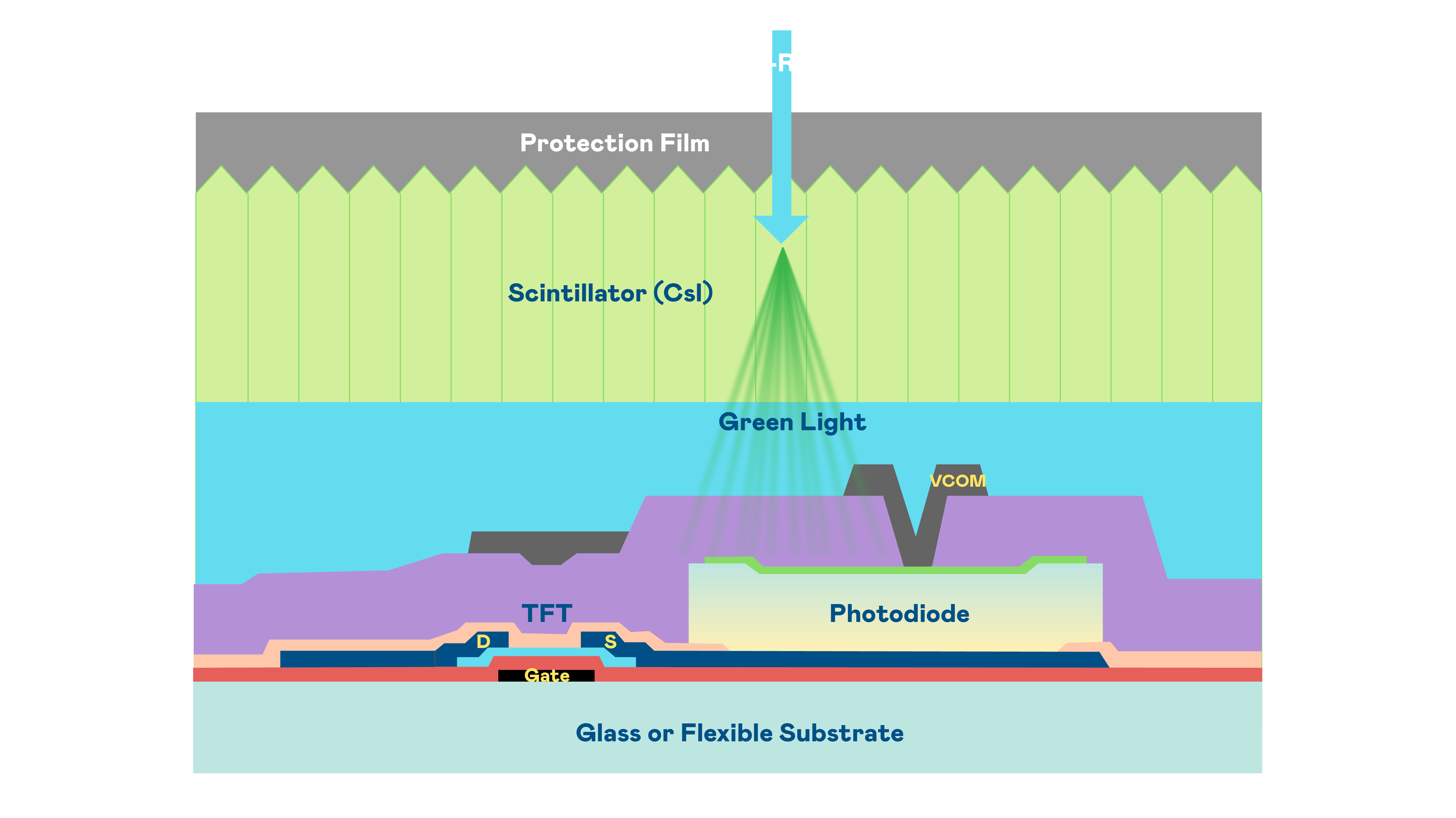 MK体育的X光影像感测阵列使用薄膜电晶体 (TFT) 作为每个像素的读取开关,搭配光电二极体(Photodiode)的光电转换元件,用以感测X光影像讯号。